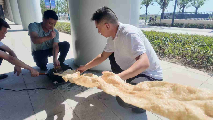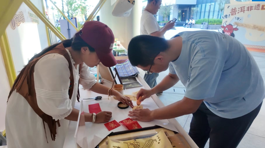 在非物质文化遗产体验区,普洱茶制作技艺进行了现场展示,市民游客可亲手参与,体验制作过程;傣族非遗炸牛皮打卡区则极具创意,“巨型”炸牛皮成为现场关注焦点,吸引不少人驻足打卡;不仅如此,绝版木刻、傣族金水漏印等非遗技艺也同步呈现,通过看、学、做,让大家直观感受普洱非遗的匠心与魅力。同时,非遗少数民族歌舞展演轮番上演,悠扬的歌声与灵动的舞姿展现普洱民族风情。